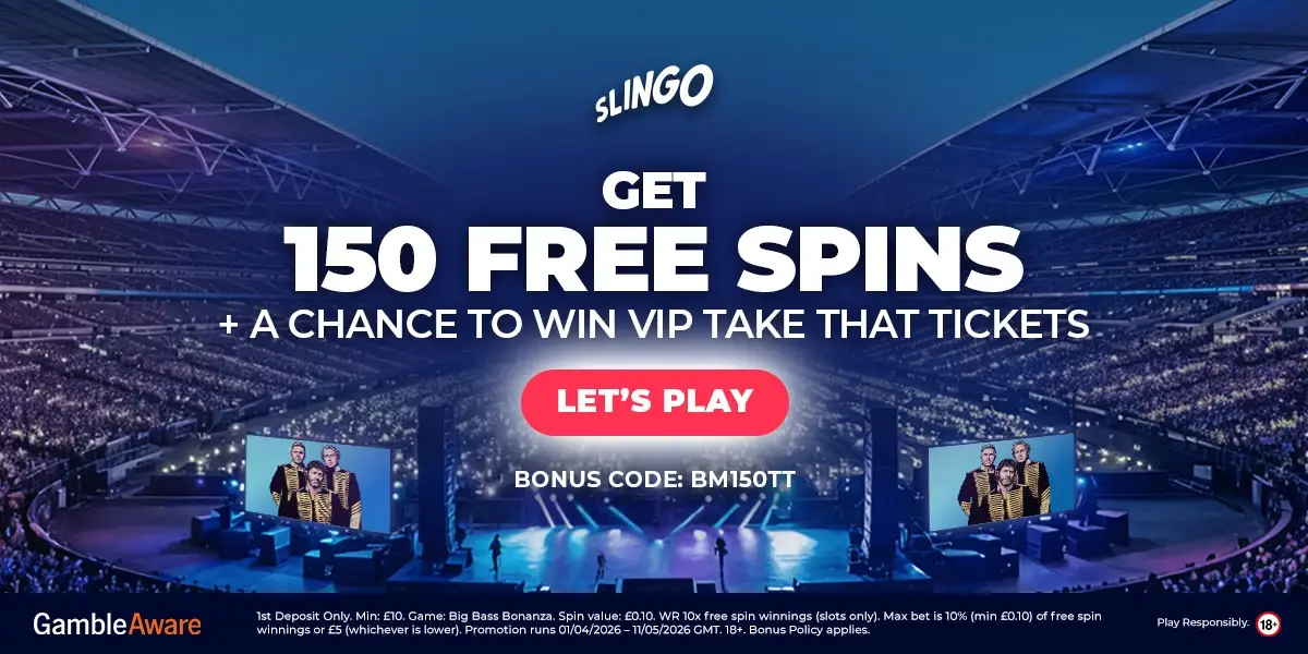 This Summer of Music Promotion keeps things simple. Make a first deposit of at least £10 with bonus code BM150TT and you’ll get 150 Free Spins on Big Bass Bonanza plus 1 prize draw entry for a VIP Take That experience at London Stadium. It’s bright, easy and very Slingo.